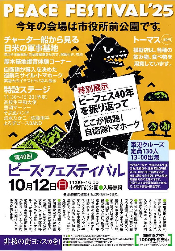 ![]() ◆トマホークは要らない・・・ピースフェスティバル開催 ![]() 基地の街・横須賀を平和な街に作り変えようと、1986年にスタートしたピースフェスティバルが40周年を迎えて10月12日開かれました。国際反戦デー(10月21日)に合わせ10月に三笠公園で開かれてきましたが、今年は公園の改修工事のため市役所前公園での開催となりました。参加者は、展示パネルやチャーター船での軍事基地の現状を認識し、模擬店での買い物、ステージの演奏などを楽しみました。 この10年、「戦争ができる国」から「戦争する国」への流れは急速に早まっています。米兵器の爆買い、 ![]() ![]() 横須賀市は、今年の開催に対して『ピースフェスティバルのサブタイトルにある、海上自衛隊に配備される米国製巡航ミサイル「トマホーク」に関する記述が「市の政治的中立性を損なう」として、後援をしない』旨を通知してきました。実行委員会は「長年市と築いてきた関係性が揺らぐのではないかと思い残念、来年以降の開催に向けて話し合いを続けていく」としています。 ![]() ◆護憲後退の中で・・・参議院議員選挙をうけて 第27回参議院選挙は、自公を過半数割れに追い込みながら、改憲派の3分の2議席を許し、護憲派総体は後退、国民の分断はより一層進みました。昨年からの国会討論、選挙戦を通じて、各党の「点数取り合戦」とも評すべき「大衆の心に刺さる〝とがった政策〟を打ち出すか」に力点が置かれ、「自国の利益のみを追及する」「軍事には軍事で対抗する」国際社会の雰囲気が形成され、戦後社会の大きな曲がり角を迎える中で、将来ビジョンは語られませんでした。 その中で国民民主党と参政党という「右派ポピュリズム」政党が大きく伸長し、保守党も議席を獲得しました。立憲野党では、立憲民主党は現有議席にとどまり、れいわは1議席増、共産党は7から3議席に後退しました。 富の一極集中、貧富格差を克服する社会ではなく、自分の目の前の利益にとらわれる社会が作られつつあります。国民民主の「現役世代の手取りを増やす」との訴えへの支持は、将来への希望のなさが、国民に鬱積している現れといえます。参政党は、「外国人から日本人の利益を守る」と外国人排斥政策で支持を獲得しました。欧米での移民排斥にも繋がる訴えです。 改憲・戦争準備・国民生活の破壊とともに、この国の民主主義そのものの危機を迎えています。次期衆議院選挙は遠くありません。立憲勢力の準備が急がれます。 ![]() ◆自公政権の過半数割れへ・・・参議院議員選挙 ![]() もしホルムズ海峡が封鎖されれば、日本は2015年に強行された安保法制による集団的自衛権行使の「例示」に安倍晋三首相(当時)が挙げた「事態」として自衛隊の出動すら強行されかねません。 オランダのハーグで6月25日に開かれたNATO首脳会議は、トランプ米政権が要求した軍事費のGDP比5%への引き上げに合意しました。石破首相は当初、首脳会議への傘下をもくろみましたが、参議院選挙での争点化を恐れて見送りました。 今次参議院選挙は、米国の戦争に日本が巻き込まれる事を阻み、私達が目指す憲法を活かし、平和と暮らしを守る政治へ転換できるかどうかという重大な選択を迫っています。日本が正に重大な岐路に立つ選挙です。護憲勢力の躍進で自公政権を過半数割れに追い込みましょう。 ![]() ◆原発回帰へ暴走・・・「7次エネ計画」を閣議決定 福島原発事故から14年目を目前に、石破政権は原発の最大活用に舵を切る第7次エネルギー基本計画を閣議決定しました。福島原発事故の被災者は今なお故郷を奪われ、生活再建へ裁判を闘っている人も多くいます。 浪江町の事故発生時の人口は2万1千人。全員避難し、今も1万9千人が帰れていません。能登半島地震は、原発事故が起こってからの避難が不可能であることを白日の下にさらし、避難計画の空虚さを見せつけました。 原発のコストとリスク、解決できない核のゴミ問題に背を向け、政権が決定した基本計画では、40年度で原発は20%を占めています。「可能な限り原発依存度を低減する」方針は消され、老朽原発を稼働させ、新増設するのです。 また、化石燃料依存を続け、過大なエネルギー需要予測もあります。その結果、「1.5度目標」という先進工業国としてとるべき責任を果たそうとしません。24年は単年度ながら世界も日本も1.6度の上昇を示しました。農業や漁業で、そして自然災害でも気候危機の兆候が随所に現れています。今とるべきは再生エネルギーへの抜本的転換と省エネ技術の追及であり、脱原発です。 ![]() ◆敵基地攻撃と一体 大軍拡計画の一環・・・能動的サイバー防御法 ![]() 石破政権は「重大なサイバー攻撃を未然に防ぐ」とする「能動的サイバー防御」を導入するための関連法案を閣議決定し、衆議院に提出しました。金融機関や交通機関のシステム・トラブルが続く中で、セキュリティの強化が市民の関心を集めています。このような背景の中で、攻撃元サー